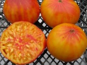 Плоды округло-плоские, желтого цвета с розовыми полосками, сладкие, до 400г.